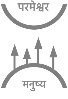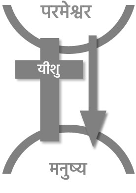 परमेश्वर और हमारे बीच एक बहुत बड़ा फासला है। इस चित्र में तीरों के चिह्न यह दर्शाते हैं कि हम किस तरह से अपने प्रयत्नों/प्रयास से परमेश्वर तक पहुँचना चाहते हैं…दूसरों के प्रति अच्छे काम कर के, धार्मिक रसम रिवाज कर के, अच्छा मनुष्य बनने का प्रयास करके, इत्यादि। पर समस्या यह है कि हमारे हर अच्छे से अच्छे प्रयास भी हमारे पापों को छिपाने में, या उन्हें मिटाने में अपर्याप्त होते हैं।